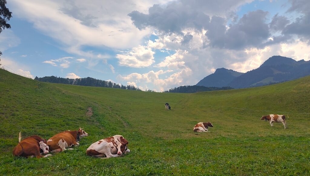 Nous avons croisé des vaches extrêmement photogéniques, qui avaient l’air de vivre leur meilleure vie, c’est à dire selon ma définition personnelle : buller dans l’herbe sans travailler en regardant les montagnes avec les coupines. Achille a d’ailleurs fortement suspecté que ce soient des animatroniques financés par l’office du tourisme local.