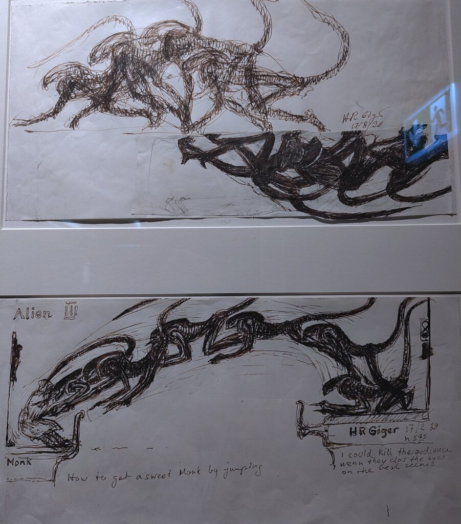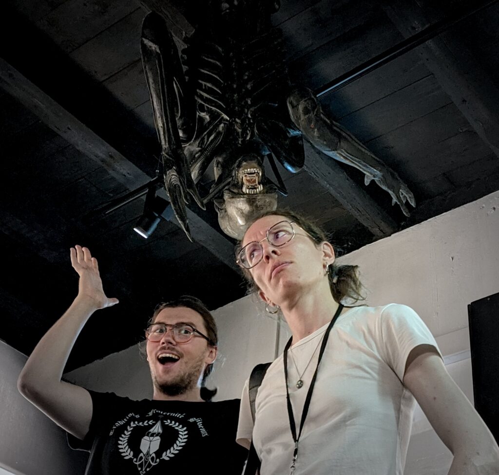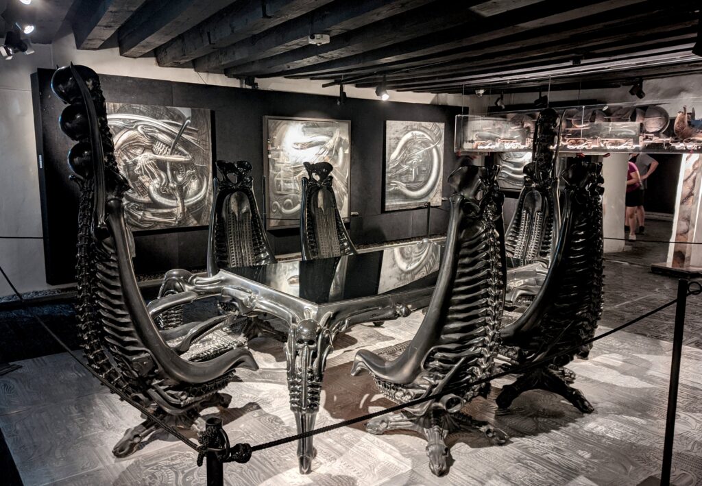 Donc H. R. Giger (1940-2014) est un artiste, designer et plasticien suisse. Il est dénommé Hans Ruedi de son petit nom, ce qui évoque un lapin malicieux ou un farfadet du folklore allemand : la confusion est classique mais regrettable. Giger doit une partie de sa notoriété au fait d’avoir créé les design et effets visuels (oscarisés) du film Alien, et notamment el famoso xénomorphe, présent en quatre (4) exemplaires grandeur nature dans le musée. Au delà de ses travaux autour du film, le musée expose de nombreuses oeuvres, peintures, sculptures, dessins et meubles de l’artiste où l’on peut s’imprégner (brr) de son univers créatif et visuel, et après réflexion, nous sommes tombés d’accord sur un point : le monsieur n’avait pas l’air d’aller très bien.