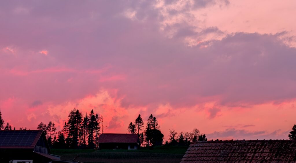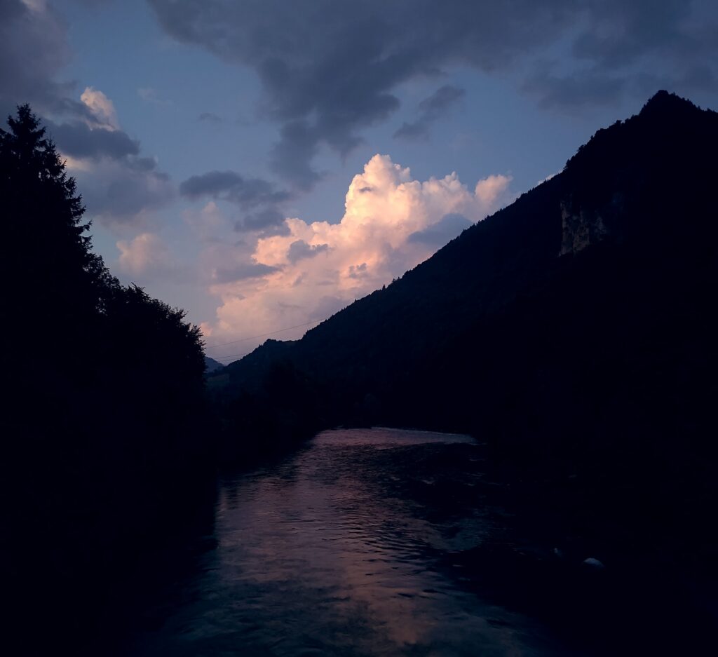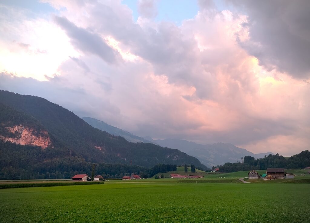 Nous sommes paisiblement rentrés dans nos pénates roulantes et, le parking de la maison du Gruyère manquant définitivement de charme, nous avons dégoté une place pour la nuit à côté de l’aérodrome, ce qui nous a permis de rêver un peu devant les machines volantes (encore une référence à Ghibli). Les nuages et les montagnes se teintaient d’un rose doré resplendissant.