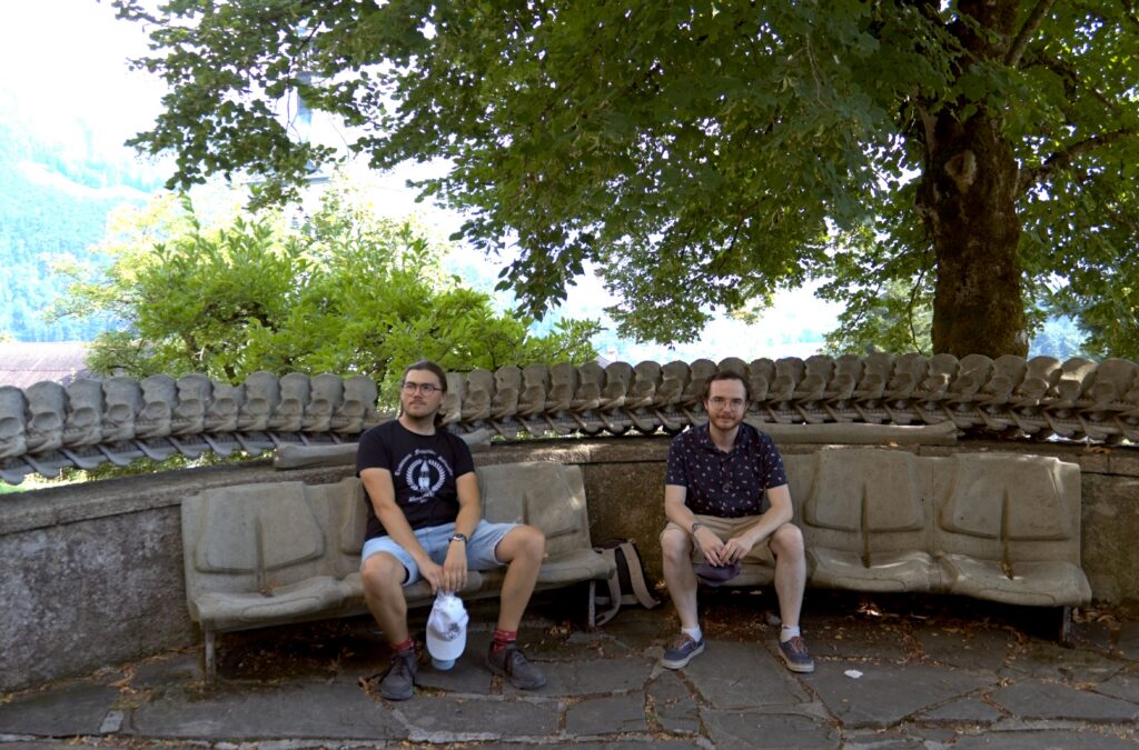 Nous avons terminé la visite et nous nous sommes promenés dans le petit jardin charmant du musée qui donne sur la jolie ville, hihihi, et avons échoué nos fesses sur les bancs en béton composite figurant des genres de colonnes vertérbrales. Kawaii !!! On a jeté un coup d’oeil au bar Giger en face du musée qui arbore un intéressant décor du même acabit que les bancs, mais découragé par l’atmosphère bruyante, et un peu nauséeux de toute cette surenchère organique, nous nous sommes finalement extraits de l’univers tordu mais fascinant de Giger, et avons fini sur une terrasse d’un bar tout ce qu’il y a de plus classique, à déguster de délicieuses glaces. Gruyères héberge en effet une chocolaterie qui se visite, ce que nous avons délaissé au profit du musée susdit, parce que nous sommes des gens malsains (est-ce que j’ai mentionné que Maël avait déjà visité ce musée DEUX FOIS, et qu’il a INSISTÉ pour qu’on y aille ? Sous ses airs angéliques il cache bien son jeu). [ndlr de Maël: tout à fait 🙂 ]