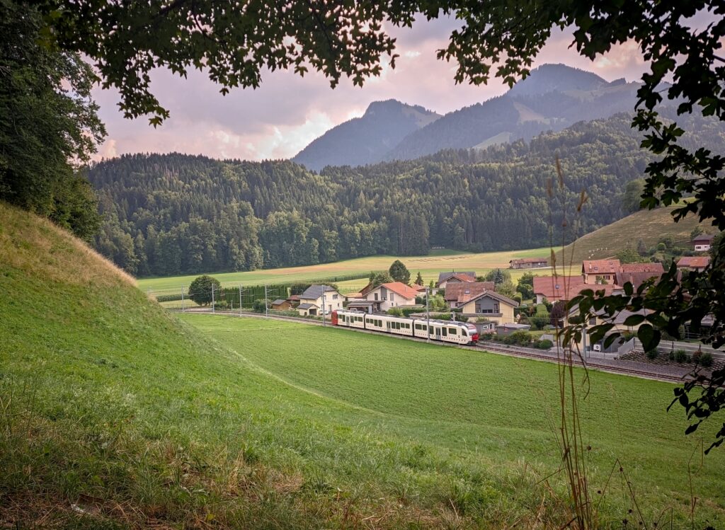 Cette fastidieuse mais nécessaire clarification du contexte fromager étant faite, nous approchions du petit village de Gruyères à travers des paysages qui se suissifiaient à une vitesse déconcertante. Nous traversions des palanquées de collines à l’herbe toujours plus verte et de montagnes aux sapins toujours plus pointus, des troupeaux de chalets de bois et de vaches broutant au son de leurs cloches pour fabriquer fissa le bon lait nécessaire au fromage susmentionné. Le paysage s’escarpisait pas mal aussi, méritant son nom de pré-Alpes (une pré-Alpes est un peu aux Alpes ce que le pré-ado est aux ados : moins grand, moins froid, moins sec et un peu plus family-friendly). Nous avons laissé le camping-cloush au parking de LA MAISON DU GRUYERE (foreshadowing), pris nos petits sac à dos et en route. Le chemin vers le vieux village traversait d’abord une voie ferrée avant de serpenter vers les hauteurs. Nous avons rêveusement regardé un petit train se perdre dans les environnantes collines, comme dans un film du studio Ghibli.